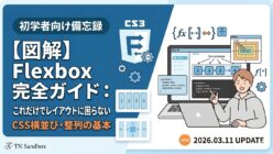 Web制作 (HTML/CSS)【図解】Flexbox完全ガイド:これだけでレイアウトに困らない(初学者向け備忘録) CSSのFlexbox(フレックスボックス)を初学者向けに図解。中央揃えや横並び、検証ツールの使い方も解説!レイアウトに迷わないための保存版備忘録です。 2026.03.11Web制作 (HTML/CSS)