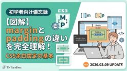 Web制作 (HTML/CSS)【図解】マージンとパディングの正体|余白を制する者はデザインを制す(初学者向け備忘録) CSSで最も大切な「余白(margin/padding)」の使い分けを徹底解説。図解による違いの解説、ショートハンドの書き方、中央揃えのコツ、初心者がハマる「マージンの相殺」まで網羅。デザインの違和感を解消し、プロっぽいレイアウトを作るための保存版ガイドです。 2026.03.09Web制作 (HTML/CSS)